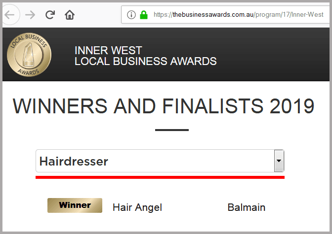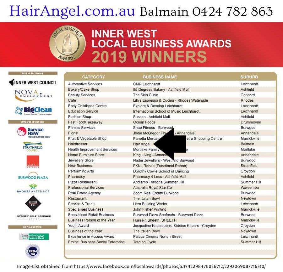 In 2019 Hair Angel won the hairdresser category in the Sydney Inner West Local Business Awards. The adjacent image is derived from the awards site. To open another image with a list of all category winners click here.